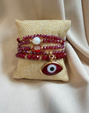 Set of 5 bracelets with crystal and 18-karat gold-plated beads. They are elastic and measure 7 inches. Stained glass charm.