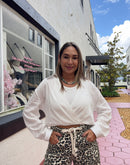 White linen shirt with a cotton top. Both pieces are attached at the waist.