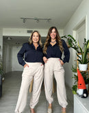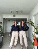 Pantalón color beige con detalle arruchado en la bota